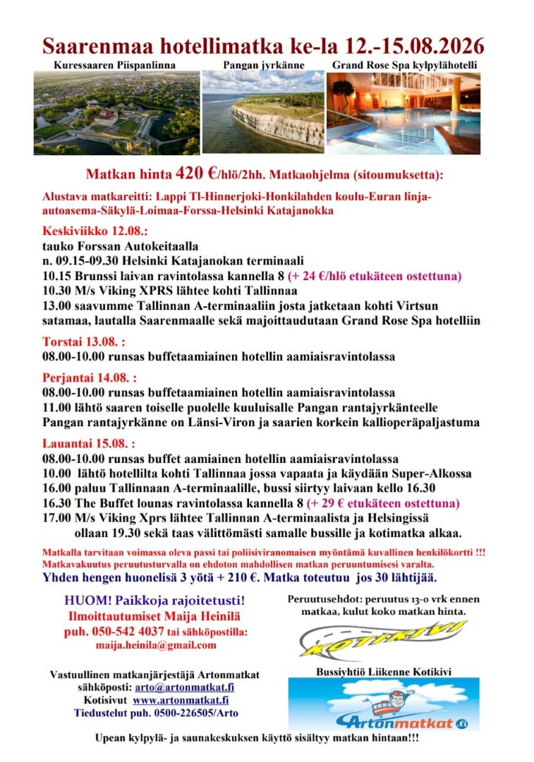 Matkanjärjestäjä Artonmatkat ja Liikenne Kotikivi. Tarkemmat tiedot matkasta löytyvät täältä.